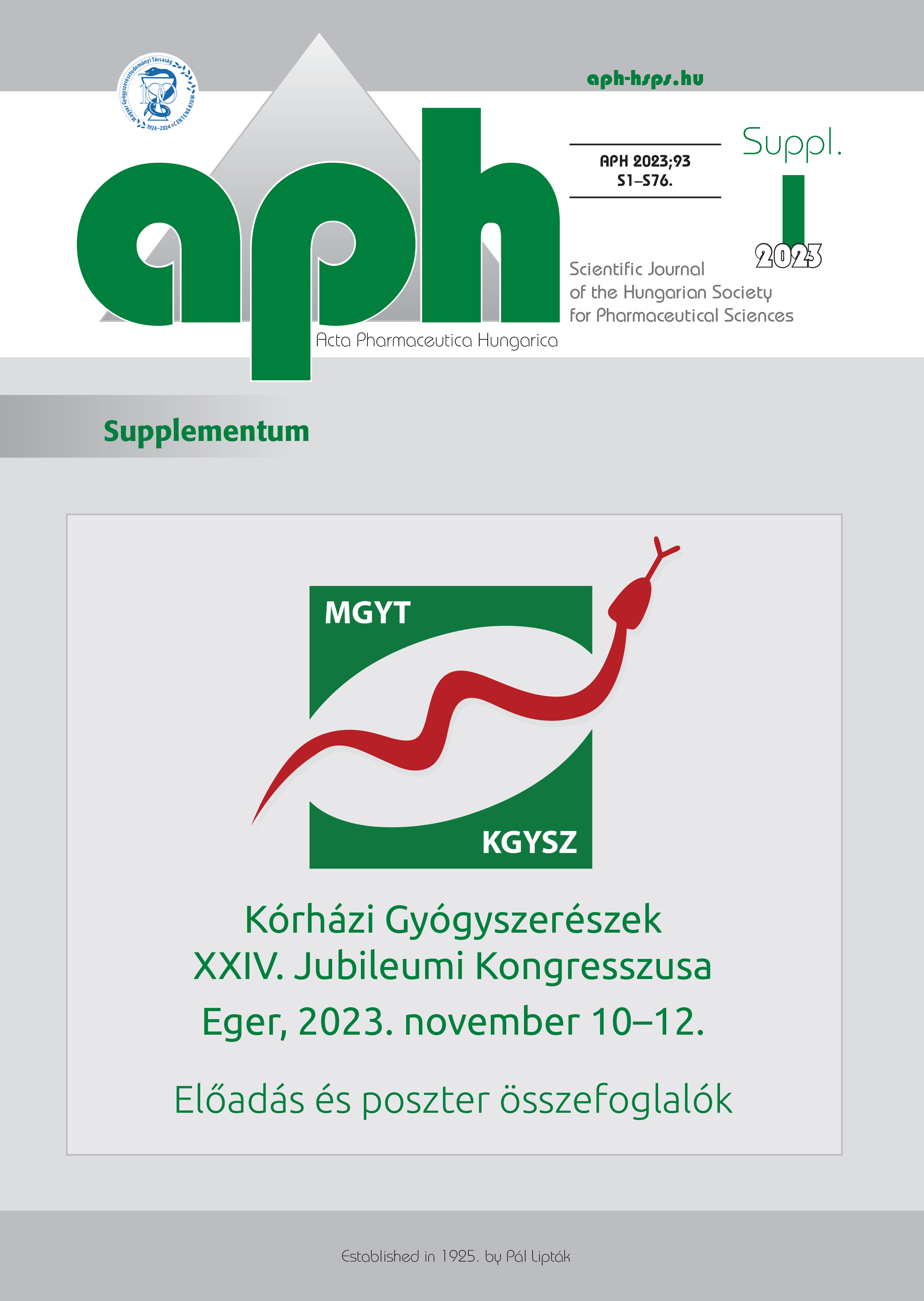 Vol. 93 No. S1 (2023)This Supplement publishes the abstracts presented at the Jubilee Congress of the Hungarian Society of Hospital Pharmacists, November 10-12, 2023, Eger, Hungary.